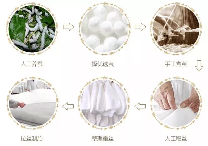严选优质蚕茧,从蚕到茧、从茧到丝、从丝到被,制作工艺严谨繁复,整个过程费时费力,只为成就一床好蚕丝被,呵护你的舒心好眠。
